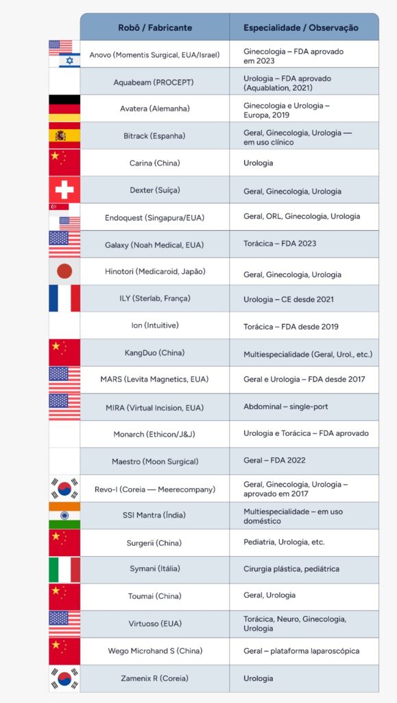 O sistema da Vinci continua sendo o padrão-ouro em cirurgia robótica, usado em prostatectomias, nefrectomias, cistectomias, pieloplastias e diversas cirurgias urológicas. Entretanto, surgem cada vez mais alternativas competitivas ampliando opções de mercado e reduzindo custos operacionais. Aqui ilustro com a tabela de novos robôs, fabricantes e especialidades. Esses sistemas emergentes oferecem inovação, flexibilidade e, em alguns casos, portabilidade superior que favorece adoção em centros menores e regiões mais remotas.