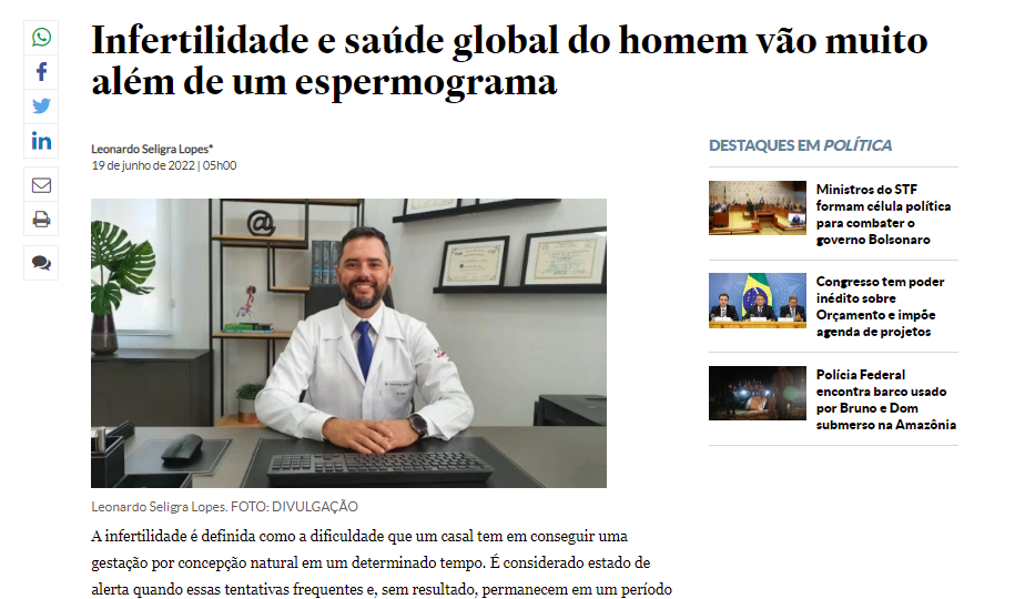 Infertilidade e saúde global do homem foram destaques no artigo publicado pelo portal de notícias Estadão.