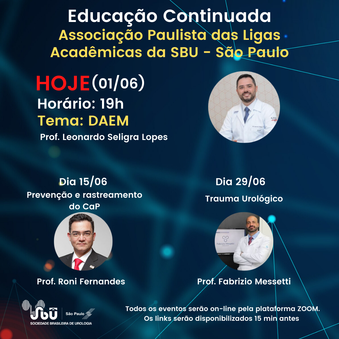 As próximas aulas do Programa de Educação Continuada das Ligas Acadêmicas de Urologia da SBU-SP já têm data definida: