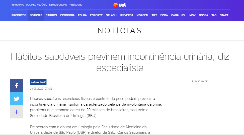 Os dados levantados pela Sociedade Brasileira de Urologia (SBU) sobre a incontinência urinária foram publicados no portal UOL.