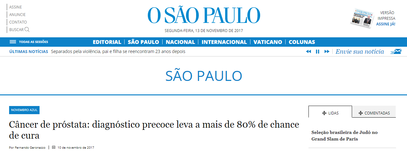 O Jornal O São Paulo deu destaque ao Novembro Azul e ao câncer de próstata em reportagem publicada no dia 10 de novembro. Dr. Flavio Trigo, presidente da SBU...